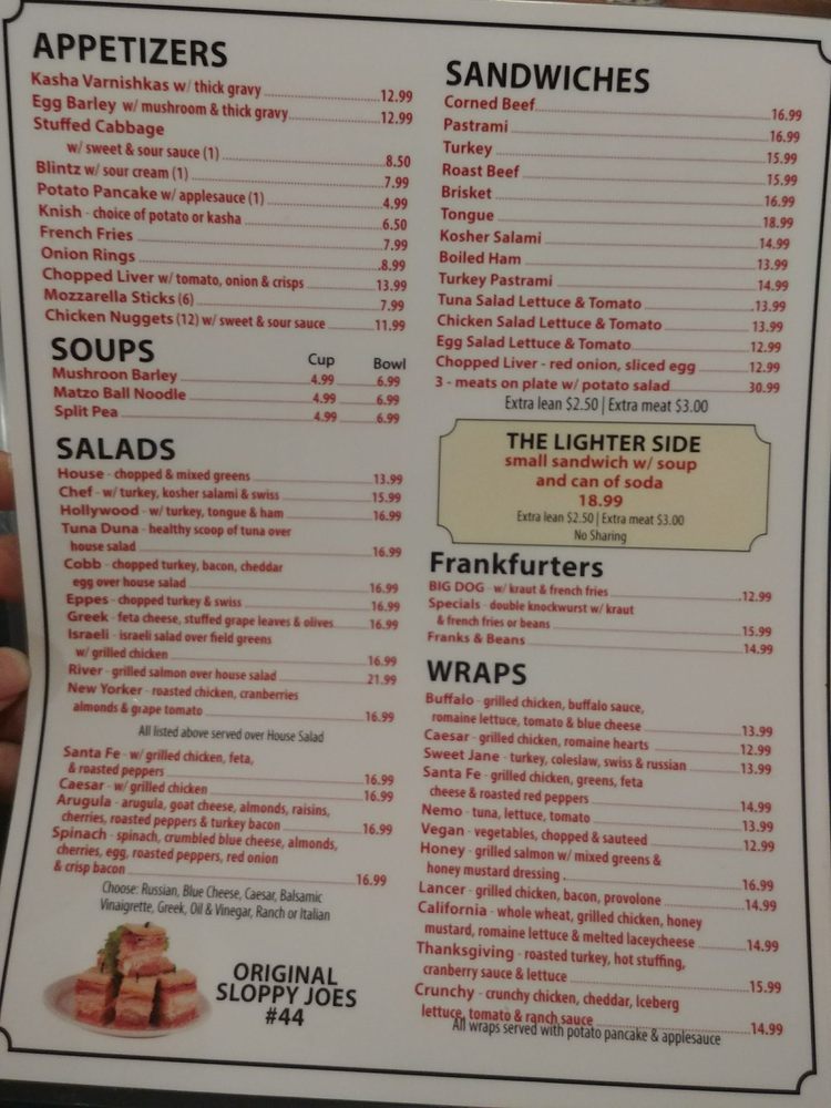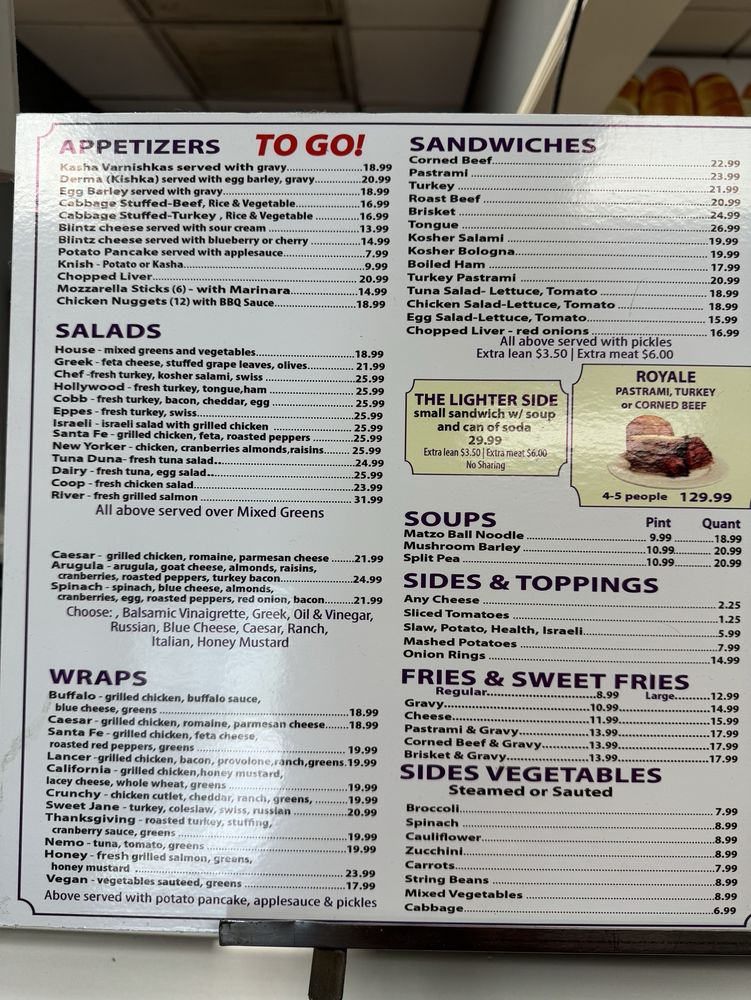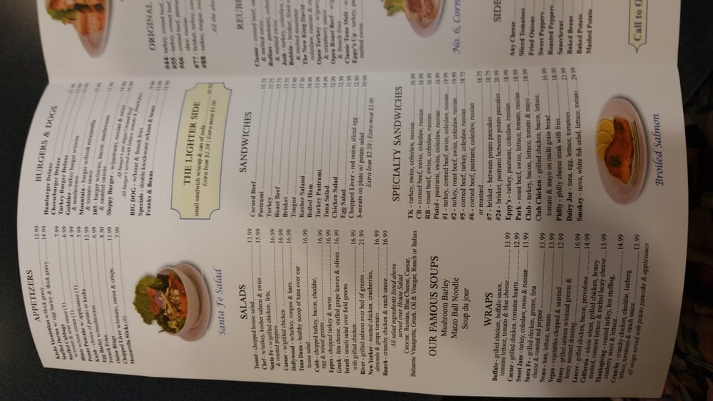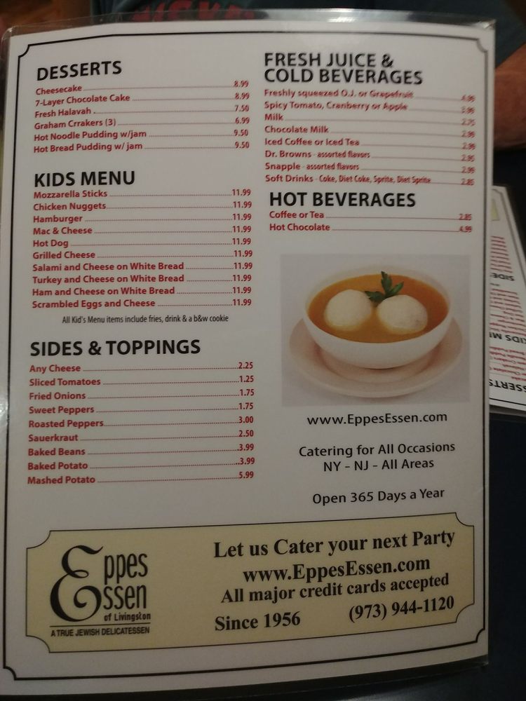 Eppes Essen Deli & Restaurant in Livingston, NJ offers a diverse menu of deli sandwiches, soups, and salads. With options for delivery, takeout, and reservations, this restaurant caters to a wide range of preferences. The appetizers include traditional dishes like Kasha Varnishkas and Cabbage Stuffed Beef Rice, while the salads feature unique combinations such as the Hollywood with turkey, tongue, and ham. The wraps offer delicious variations like the Buffalo with grilled chicken and blue cheese. Customers rave about the quality and flavor of the meals, with one reviewer praising the pastrami and tongue sandwiches. The authentic Jewish deli ambiance and friendly service add to the overall dining experience. Whether you're craving a classic deli sandwich or a hearty salad, Eppes Essen Deli & Restaurant is sure to satisfy your cravings.